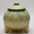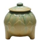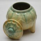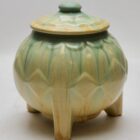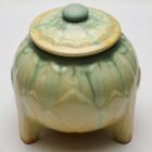 A Classic example of Art Deco earthenware, this lidded bowl (bonbonniere / tobacco pot / sugar bowl, etc.) has three rectangular feet supporting a globe-shaped pot and matching lid.