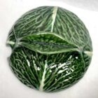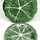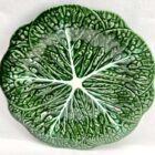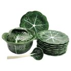 Art Nouveau Majolica glazed tableware set of 10 pieces Leaves pattern in relief.Sarreguemines Majolica is a type of earthenware, decorated with colored lead glazes. Majolica was made between 1930 and 1939Measure: 8 plates diameter 25 cm + 1 Plate 31 cmBowl with spoon Diameter 28 cm x Height 19 cmLooks simply stunning.