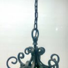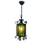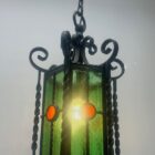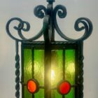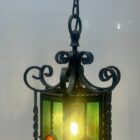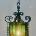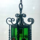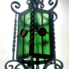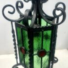 Materials: Colored glass Black painted curved iron slats pleated as a cage.