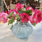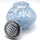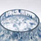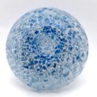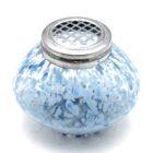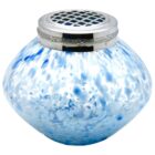 Subtle, light-blue, hand blown splatter glass vase in the Art Deco style. This design for vases is often called ‘Pique fleurs’ or ‘rose-bowl’ and is supplied with a fitted metal grille to support stems in an arrangement. The body contains a good amount of water to keep the arrangement stable and blooming.