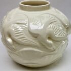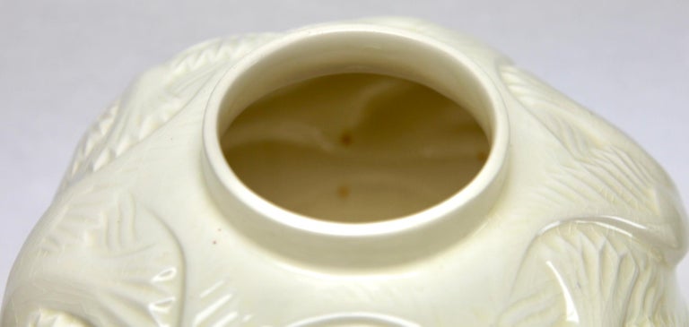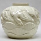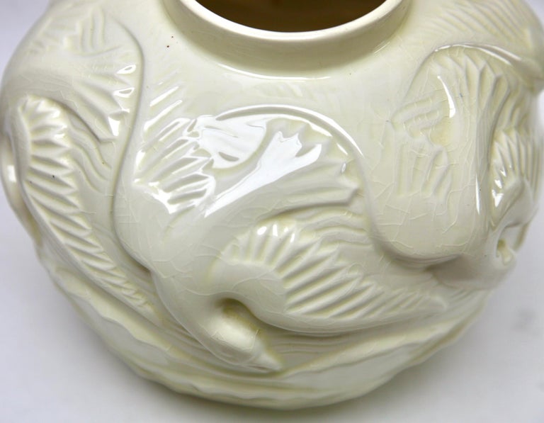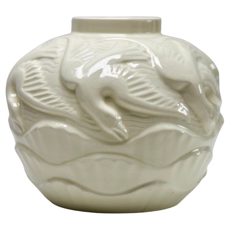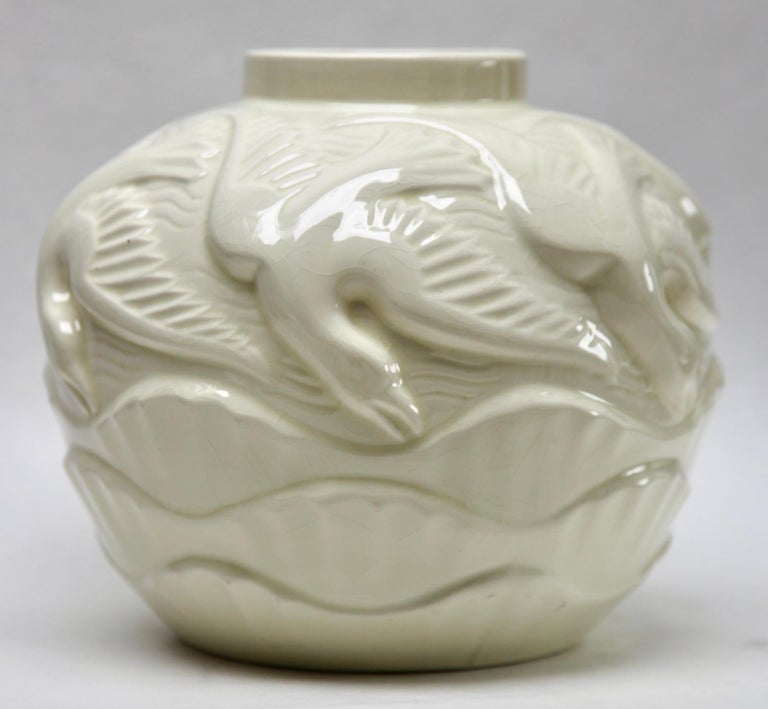 Special model from the Art Deco period executed in white Craquelure glazed earthenware and with a partially abstract decoration consisting of stylized representation of seagulls, flying above a wavy sea.