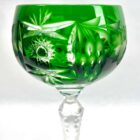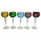 Vintage set of 5 cut to clear crystal stem glasses.Mix crystal (Bleikristall 24% Mundgeblasen Handgeschliffen) glassesClear demi crystal glass. Side facetted and toothed stem. The bowl with a colored overlay cut to clear.In best condition.