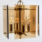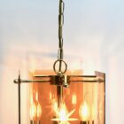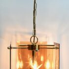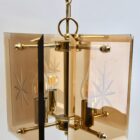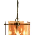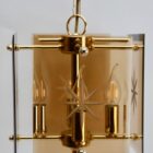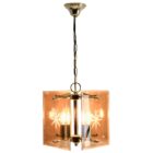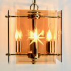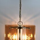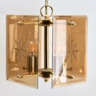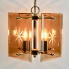 Geometric modernist design on a brass-patinated stem. Central chain and column with four pairs of arms supporting four lamps in candlestick form, and four bronze colored glass sheets acting as shades, each with an engraved star motif.