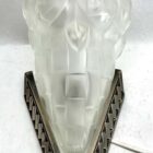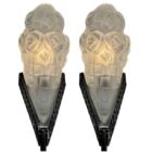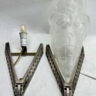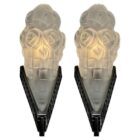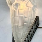 A wonderful Pair French 1930 art deco Sconces lamps made by the Paris based company of Léon Hugue, A nickel plated solid brass or bronze base holds a signed dome shaped shade by Degué. Done in clear frosted moulded-pressed glass.Léon Hugue was a producer of art deco lighting in Paris during the interbellum (at 10 rue Pierre-Levée). He often used Degue made shades for his fixtures.And safe for Usage in the World.Please don’t hesitate to get in touch with any further questions. With Best Wishes, Geert