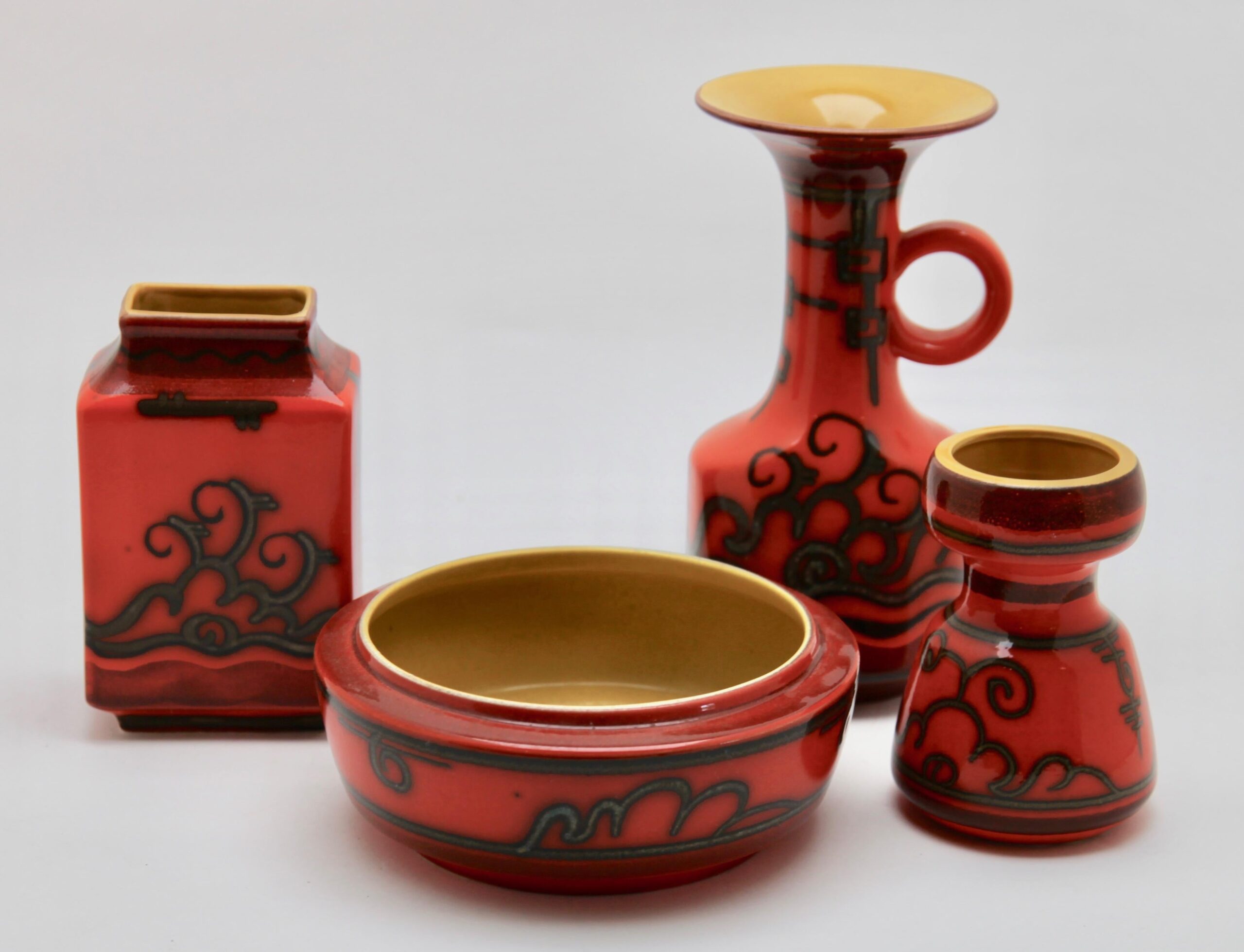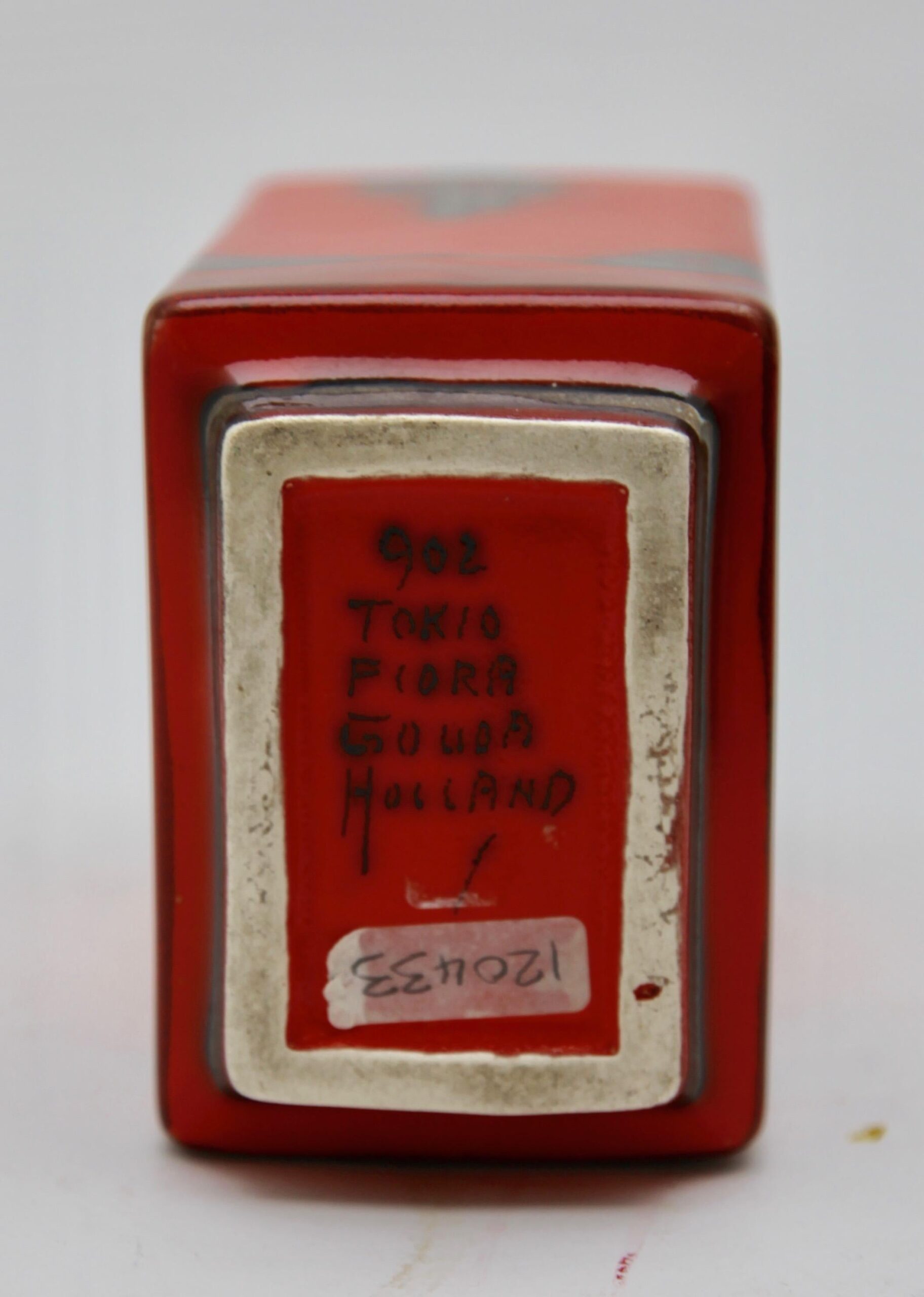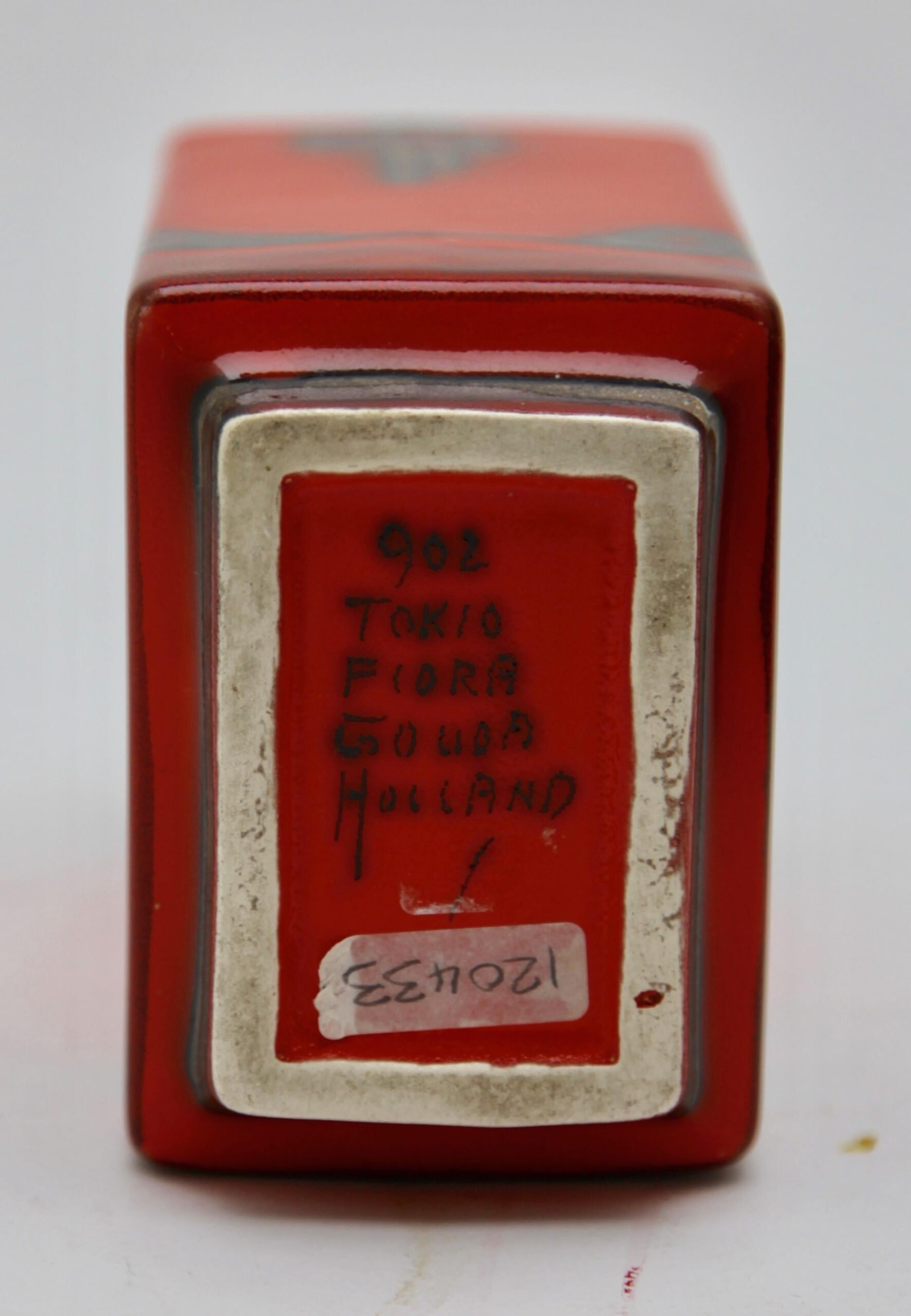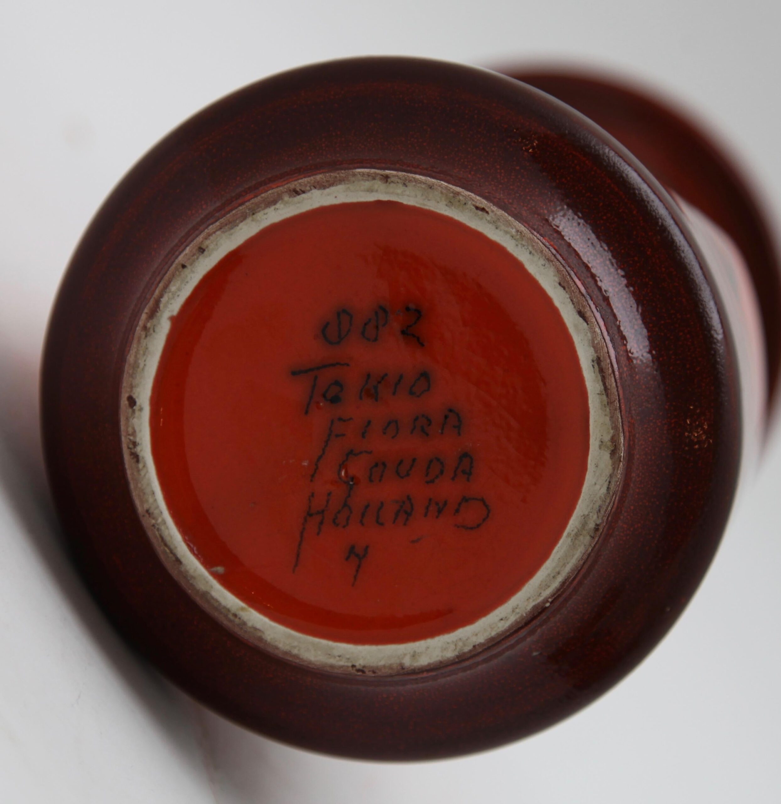 Dutch pottery from the famous Gouda factory hand painted with shaded grey motifs on a distinctive orange ground. This range became hugely popular in the early 1970s and since then has become a popular collectible. Each piece is individually signed with model number and decorators mark as well as the factory marks.