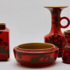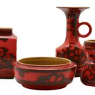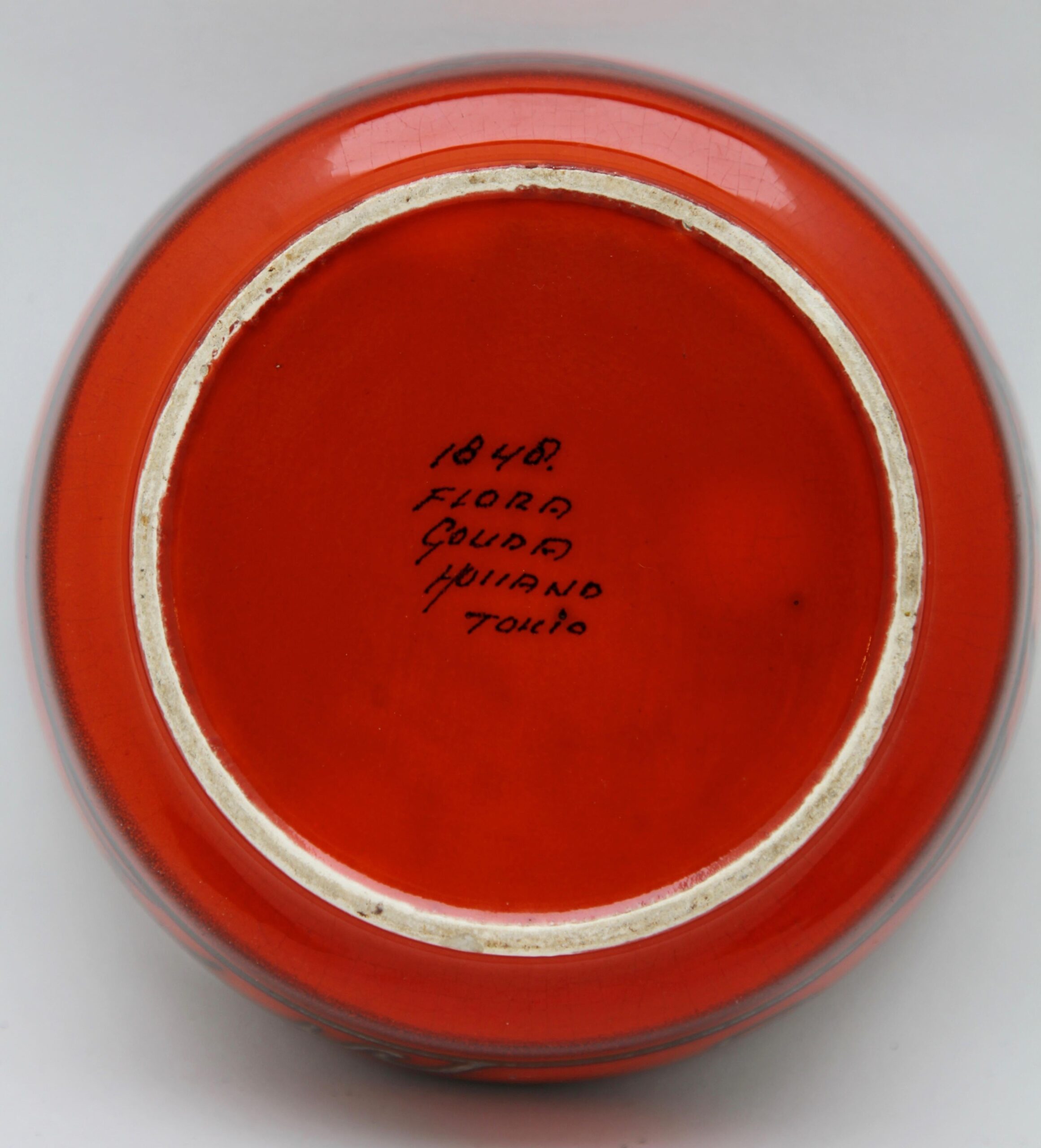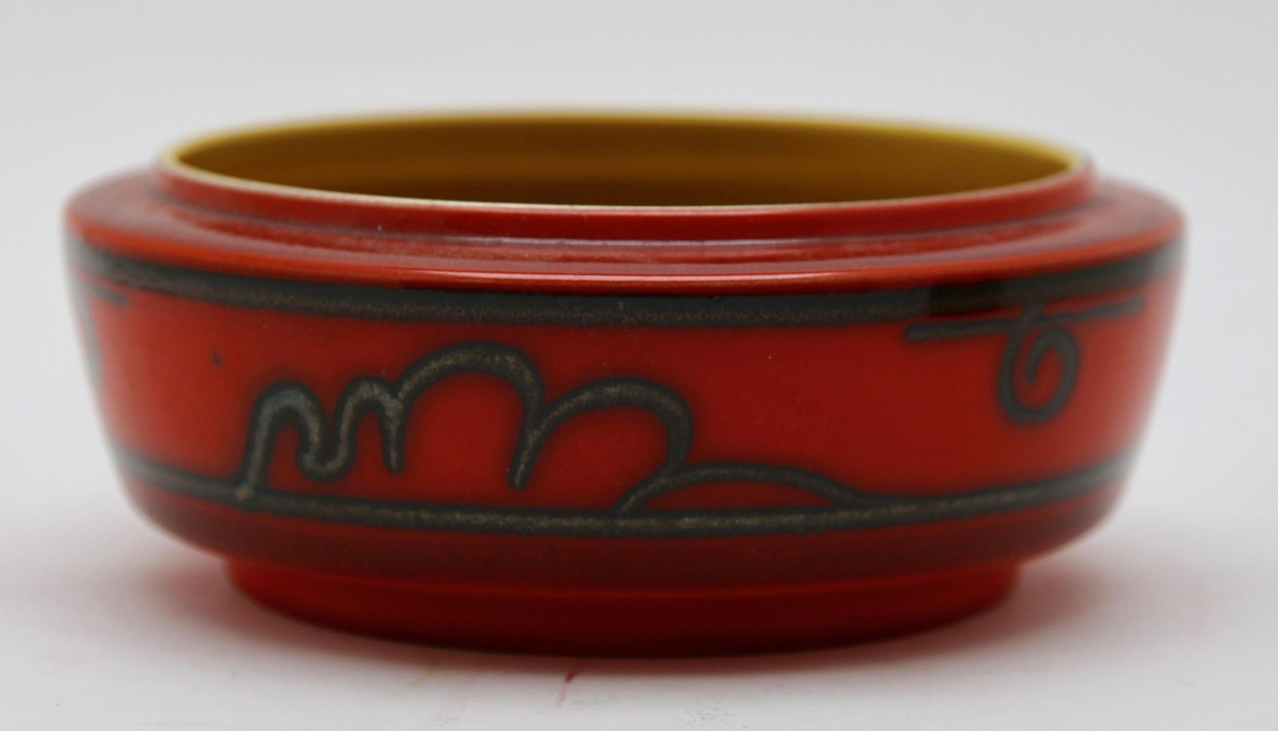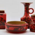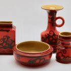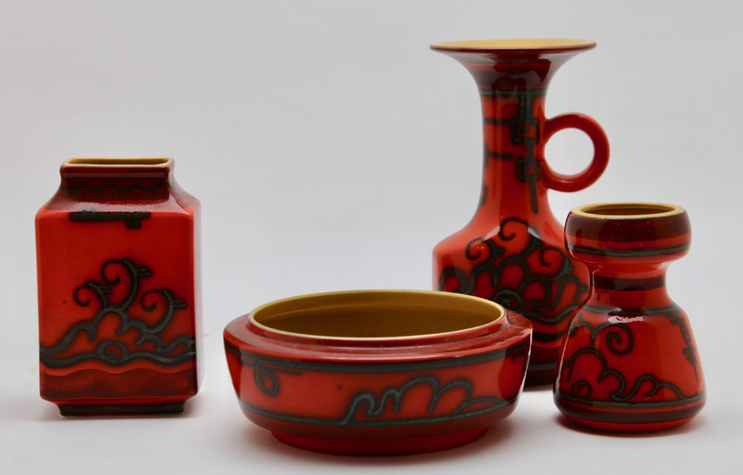 Dutch pottery from the famous Gouda factory hand painted with shaded grey motifs on a distinctive orange ground. This range became hugely popular in the early 1970s and since then has become a popular collectible. Each piece is individually signed with model number and decorators mark as well as the factory marks.