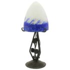 Crowned with bright colored shades in mottled glass paste with blue highlights.