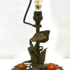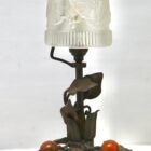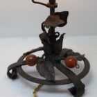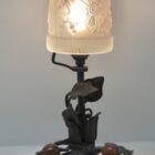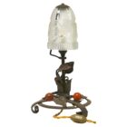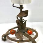 A wonderful French Art Nouveau lamp. The stands are handmade in wrought iron with black finish patina and hammered with a floral pattern. The metalwork is of excellent quality.