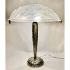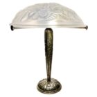 A wonderful French 1930 art deco table lamp made by the Paris based company of Léon Hugue, A nickel plated solid brass or bronze base holds a signed dome shaped shade by Degué. Done in clear frosted moulded-pressed glass.Léon Hugue was a producer of art deco lighting in Paris during the interbellum (at 10 rue Pierre-Levée). He used  Degue made shades for his fixtures.“Very good conditionPlease don’t hesitate to get in touch with any further questions.