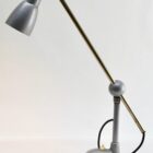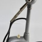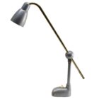 Industrial angle poise work-light featuring adjustable bar for height, rotation and angle, and rigid curved end-section with the lamp mounted on a ball-fitting to provide easy and direct hand-adjustment to the exact lamp position required.