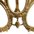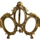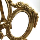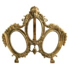 Framed space for 3 photographs/pictures (oval front cover glass; 13cm high x 8cm wide, 5.11 high x 3.14 inches wide) presented amid a traditional decor of garlands and bows in the repoussé style.