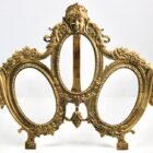 Original Victorian period triple photograph frame (or miniature frame) with classical Victorian ‘Lover’s Knot’ design. Typical frame for wedding photographs. Made of solid cast brass with a highly polished front surface and glass front
