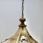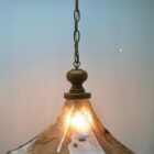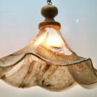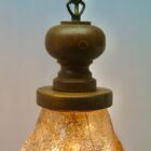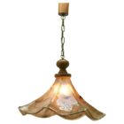 This carefully made glass lampshade with streaks of green on a glass base and a delicate green edge along the ruffled edge provides the color contrast. The body picks up the colour from the lamp-bulb and gives a strong downlight suitable for hanging over a table, or a central position in the room.