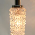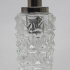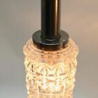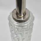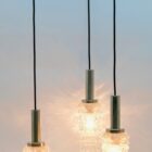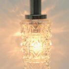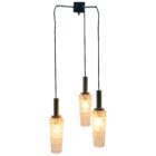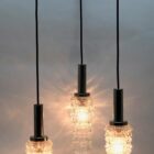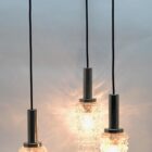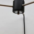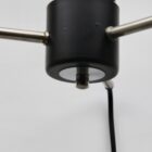 Mid-Century Modernist chromed triple-cable pendant lamp with adjustable flexes, so that you can hang the lamps at different heights by retracting the cables into the ceiling plate. The three lamps are held by a simple chromed spreader bar. This is a typical understated modernist lamp for a dining room table, and works best with a dimmer so that it can be both