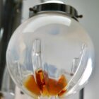 Pendant with a globe of clear glass with orange inclusions, Italy, 1970 by Mazzega.