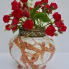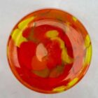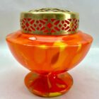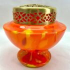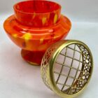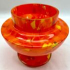 Dramatic multi color decor, cobalt and orange, in hand blown splatter glass vase in the Art Deco style. This design for vases is often called ‘Pique fleurs’ or ‘rose-bowl’ and is supplied with a fitted metal grille to support stems in an arrangement. Special color and technique for any collector.Looks simply stunning. Please don’t hesitate to get in touch with any further questions. With Best Wishes, Geert