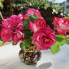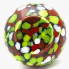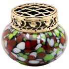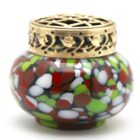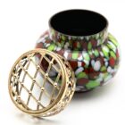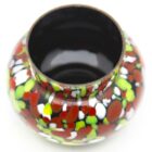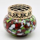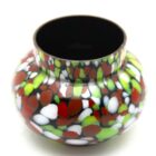 Startling spatter vase with Italian tricolor colors (green, white, red) on a dark background, in hand blown splatter glass vase in the Art Deco style. This design for vases is often called ‘Pique fleurs’ or ‘rose-bowl’ and is supplied with a fitted metal grille to support stems in an arrangement. This vase has a polished metal grille or mount with embossed roses and trellis the body contains a good amount of water to keep the arrangement stabile and blooming