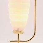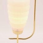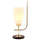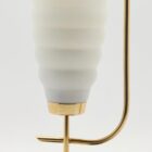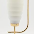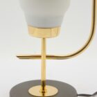 1970s table lamp in the Scandinavian style with brass fittings on a metal base. The lamp has a shade made of acid-etched milk-glass giving it a matte, white surface, and provides a strong up-light with a softer, diffused light at eye level.